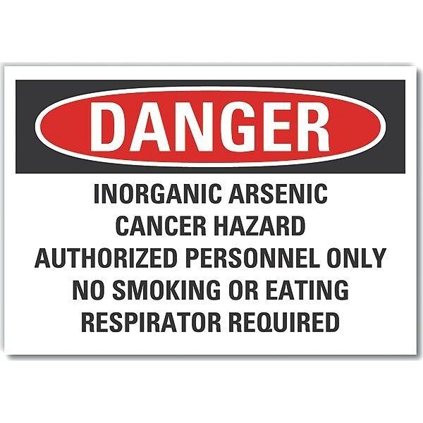 Inorganic Arsenic Danger Label, Horizontal Rectangle, Number of Printed Sides 1, English, Sign Format Traditional OSHA, Sign Legend Inorganic Arsenic Cancer Hazard Authorized Personnel Only No Smoking Or Eating Respirator Required, Sign Legend Background Color White, Sign Legend Style Text
