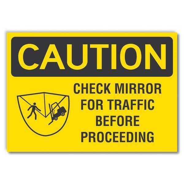 Lift Truck Caution Reflective Label, Horizontal Rectangle, Number of Printed Sides 1, English, Sign Format ANSI/OSHA Format, Sign Legend Check Mirror For Traffic Before Proceeding, Sign Legend Background Color Yellow, Sign Legend Style Symbol and Text