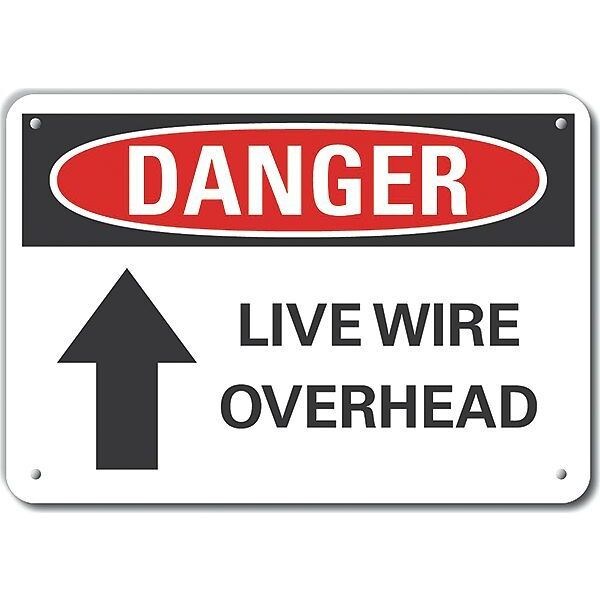 Danger Sign, Horizontal Rectangle, Number of Printed Sides 1, English, Sign Format ANSI/OSHA Format, Sign Legend Live Wire Overhead, Sign Legend Background Color White, Sign Legend Style Symbol and Text