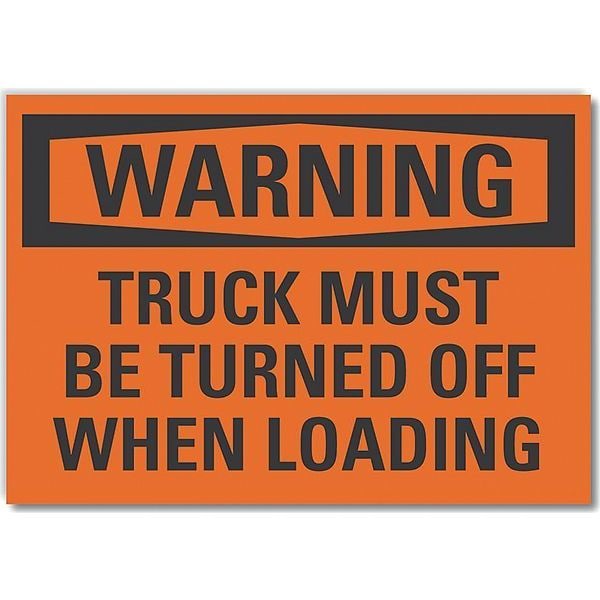 Loading & Unloading Warning Label, Horizontal Rectangle, Number of Printed Sides 1, English, Sign Format Traditional OSHA, Sign Legend Truck Must Be Turned Off When Loading, Sign Legend Background Color Orange, Sign Legend Style Text