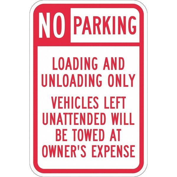 Loading & Unloading Zone No Parking Sign, Height 18 in, Width 12 in, Sign Material Aluminum, Sign Mounting Style Mounting Holes, Printed Language English, Sign Shape Vertical Rectangle