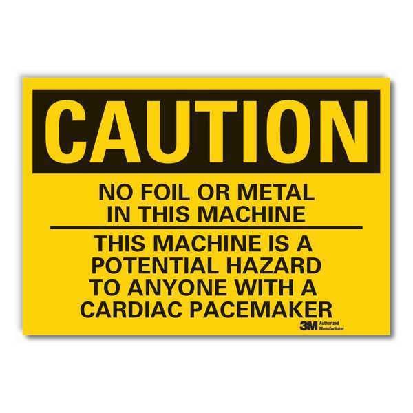 Microwave Caution Reflective Label, Vertical Rectangle, Number of Printed Sides 1, English, Sign Format Traditional OSHA, Sign Legend No Foil Or Metal In This Machine This Machine Is A Potential Hazard To Anyone With A Cardiac Pacemaker, Sign Legend Background Color Yellow, Sign Legend Style Text