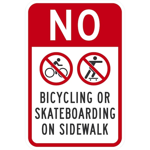 No Bicycling or Skateboarding On Sidewalk (w/sym), 12x18, Engineer Grade, White