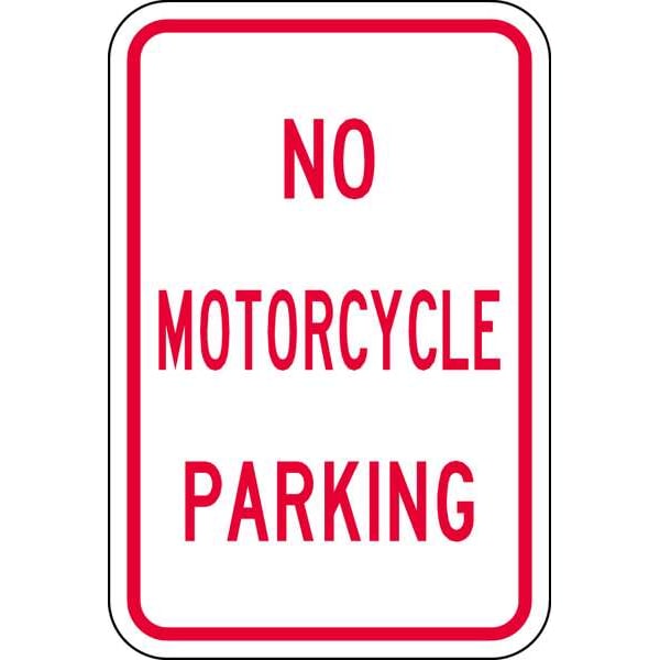 No Motorcycle Parking Sign, Height 18 in, Width 12 in, Sign Material Aluminum, Sign Mounting Style Mounting Holes, Printed Language English, Sign Shape Vertical Rectangle