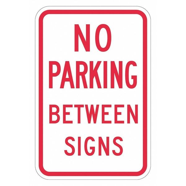 No Parking Between Parking Sign, Height 18 in, Width 12 in, Sign Material Aluminum, Sign Mounting Style Mounting Holes, Printed Language English, Sign Shape Vertical Rectangle