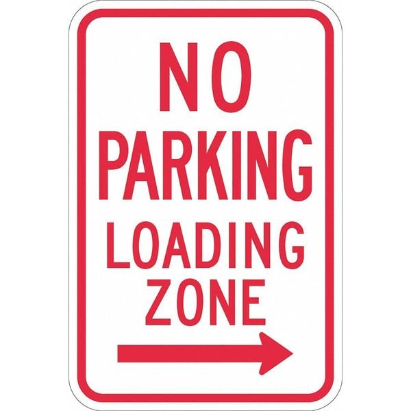 No Parking Loading Zone Right Arrow Parking Sign, Height 18 in, Width 12 in, Sign Material Aluminum, Sign Mounting Style Mounting Holes, Printed Language English, Sign Shape Vertical Rectangle