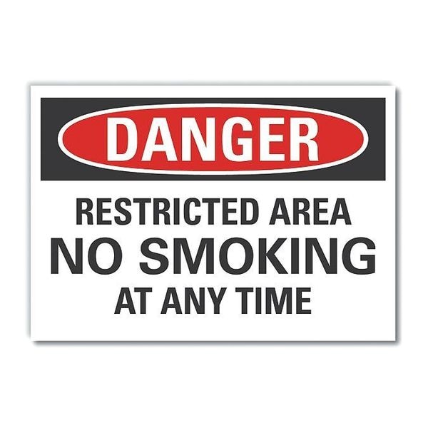 No Smoking Danger Label, Horizontal Rectangle, Number of Printed Sides 1, English, Sign Format Traditional OSHA, Sign Legend Restricted Area No Smoking At Any Time, Sign Legend Background Color White, Sign Legend Style Text