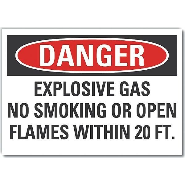 No Smoking Danger Label, Horizontal Rectangle, Number of Printed Sides 1, English, Sign Format Traditional OSHA, Sign Legend Explosive Gas No Smoking Or Open Flames Within 20 Ft., Sign Legend Background Color White, Sign Legend Style Text