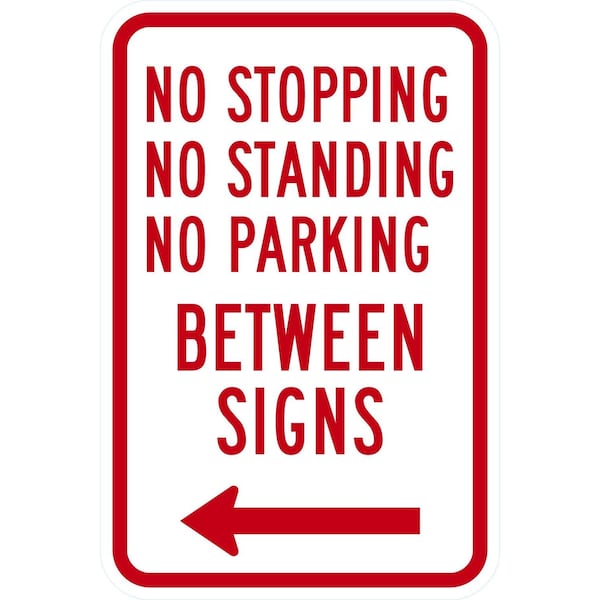 No Stopping, Standing or Parking Between Signs with Left, 12x18, Engineer Grade, White