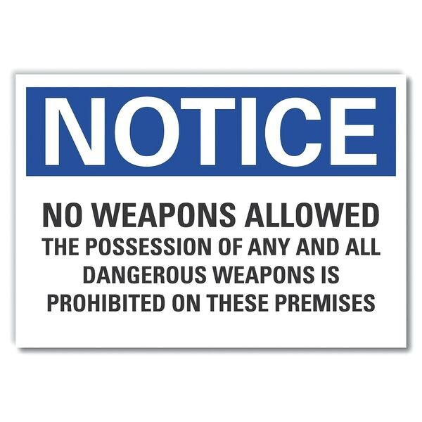 Notice Sign, Horizontal Rectangle, Number of Printed Sides 1, English, Sign Legend No Weapons Allowed The Possession Of Any And All Dangerous Weapons Is Prohibited On These Premises, Sign Legend Background Color White, Sign Legend Style Text