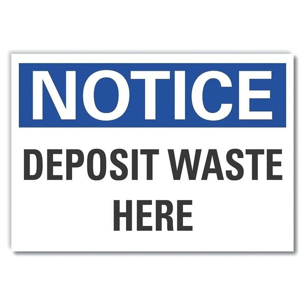 Notice Sign, Horizontal Rectangle, Number of Printed Sides 1, English, Sign Format Traditional OSHA, Sign Legend Deposit Waste Here, Sign Legend Background Color White, Sign Legend Style Text