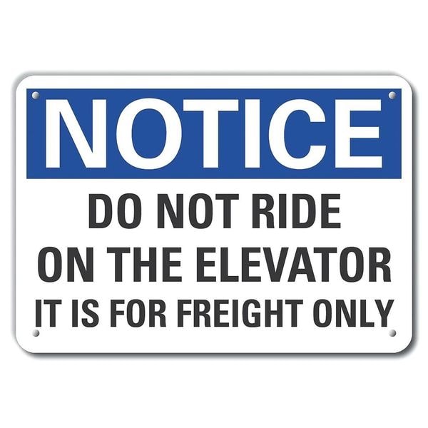 Plastic Elevator Hazard Notice Sign, Horizontal Rectangle, Number of Printed Sides 1, English, Sign Format ANSI/OSHA Format, Sign Legend Do Not Ride On The Elevator It Is For Freight Only, Sign Legend Background Color White, Sign Legend Style Text