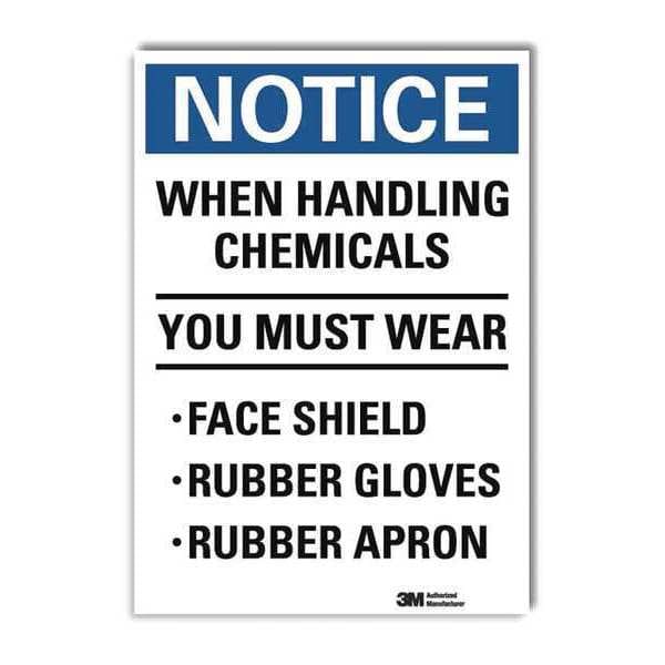 Notice Sign, Vertical Rectangle, Number of Printed Sides 1, English, Sign Format Traditional OSHA, Sign Legend When Handling Chemicals You Must Wear Face Shield Rubber Gloves Rubber Apron, Sign Legend Background Color White, Sign Legend Style Text