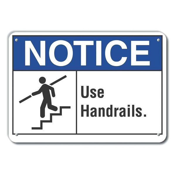 Notice, Use Handrail, 14 in W x 10 in H, Horizontal Rectangle, Aluminum