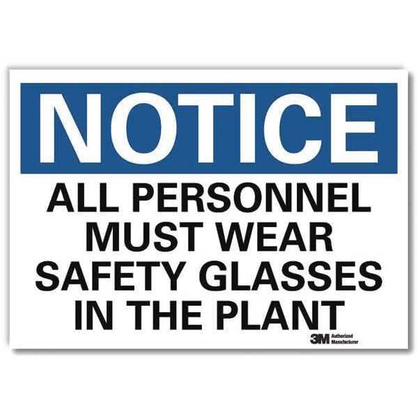 Notice Sign, Vertical Rectangle, Number of Printed Sides 1, English, Sign Format Traditional OSHA, Sign Legend All Personnel Must Wear Safety Glasses In The Plant, Sign Legend Background Color White, Sign Legend Style Text