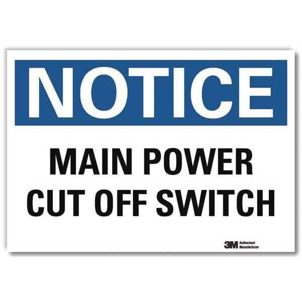 Notice Sign, Vertical Rectangle, Number of Printed Sides 1, English, Sign Format Traditional OSHA, Sign Legend Main Power Cut Off Switch, Sign Legend Background Color White, Sign Legend Style Text