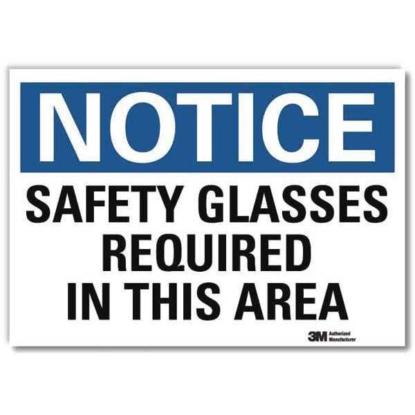 Notice Sign, Vertical Rectangle, Number of Printed Sides 1, English, Sign Format Traditional OSHA, Sign Legend Safety Glasses Required In This Area, Sign Legend Background Color White, Sign Legend Style Text