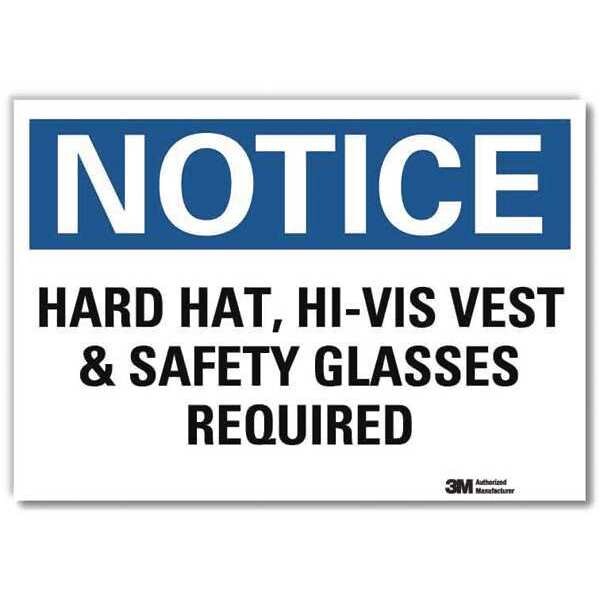 Notice Sign, Horizontal Rectangle, Number of Printed Sides 1, English, Sign Format Traditional OSHA, Sign Legend Hard Hat, Hi-Vis Vest & Safety Glasses Required, Sign Legend Background Color White, Sign Legend Style Text