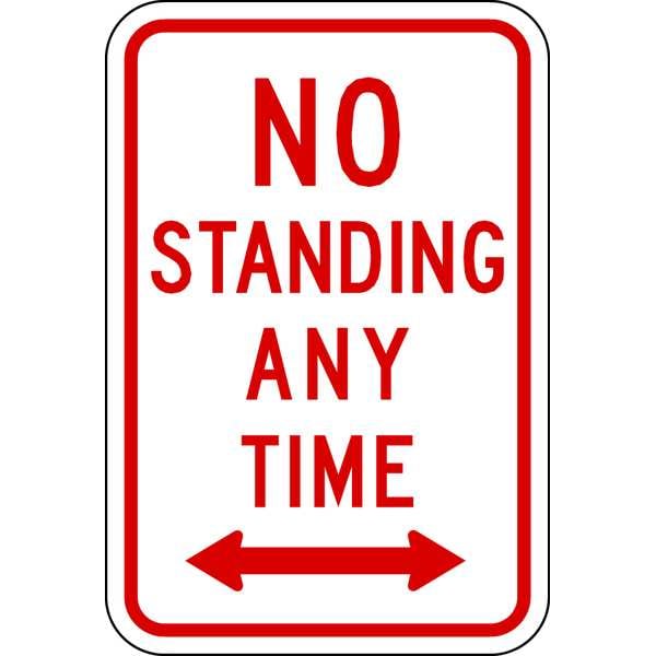 No Standing Any Time Parking Sign, Height 18 in, Width 12 in, Sign Material Aluminum, Sign Mounting Style Mounting Holes, Printed Language English, Sign Shape Vertical Rectangle