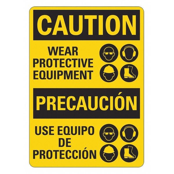 Personal Protection Sign, Vertical Rectangle, Number of Printed Sides 1, English, Spanish, Sign Format ANSI/OSHA Format, Sign Legend Wear Protective Equipment/Use Equipo De Proteccion, Sign Legend Background Color Yellow, Sign Legend Style Symbol and Text
