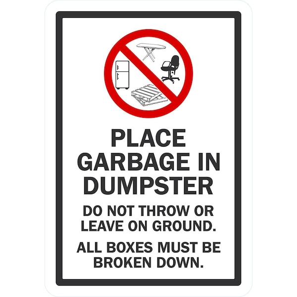Place Garbage Inside Dumpster, Do Not Throw or Leave on, 7x10, Non-Reflective, White