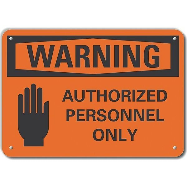 Plastic Authorized Personnel Warning Sign, Horizontal Rectangle, Number of Printed Sides 1, English, Sign Format Traditional OSHA, Sign Legend Authorized Personnel Only, Sign Legend Background Color Orange, Sign Legend Style Symbol and Text