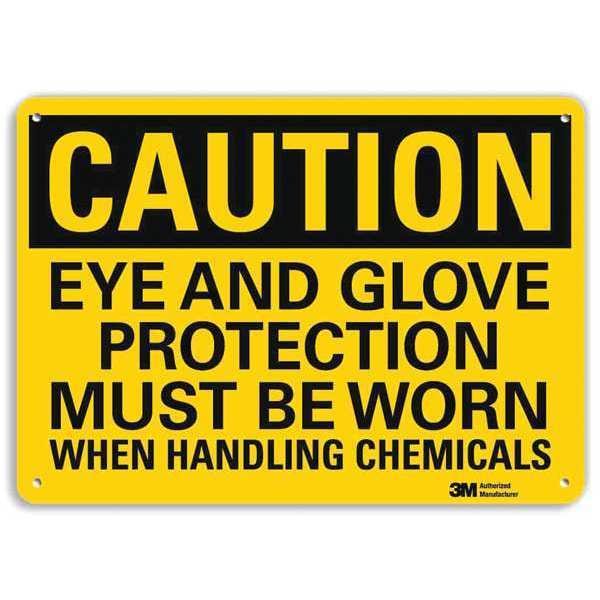 Caution Sign, Vertical Rectangle, Number of Printed Sides 1, English, Sign Format Traditional OSHA, Sign Legend Eye And Glove Protection Must Be Worn When Handling Chemicals, Sign Legend Background Color Yellow, Sign Legend Style Text