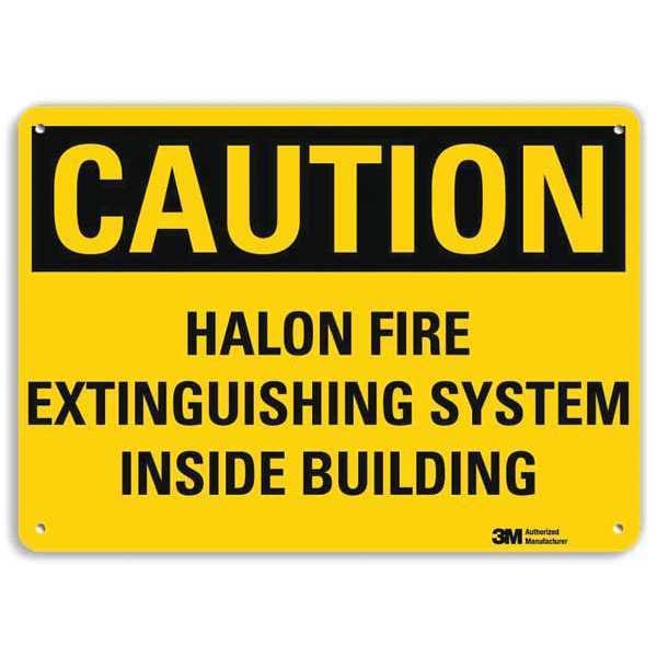 Caution Sign, Vertical Rectangle, Number of Printed Sides 1, English, Sign Legend Halon Fire Extinguishing System Inside Building, Sign Legend Background Color Yellow, Sign Legend Style Text