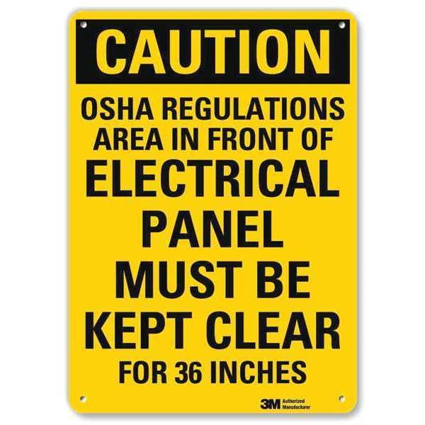 Caution Sign, Horizontal Rectangle, Number of Printed Sides 1, English, Sign Format Traditional OSHA, Sign Legend Osha Regulations Area In Front Of Electrical Panel Must Be Kept Clear For 36 Inches, Sign Legend Background Color Yellow, Sign Legend Style Text