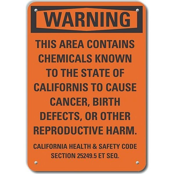Plastic Chemicals Warning Sign, Horizontal Rectangle, Number of Printed Sides 1, English, Sign Format Traditional OSHA, Sign Legend This Facility Contains One Or More Chemicals Known To The State Of California To Cause Cancer, Birth Defects Or Reproductive Harm California Health & Safety Code Section 25249 5 Et Seq, Sign Legend Background Color Orange, Sign Legend Style Text