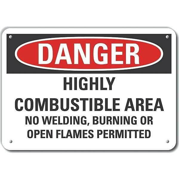 Plastic Combustible Area Danger Sign, Horizontal Rectangle, Number of Printed Sides 1, English, Sign Format Traditional OSHA, Sign Legend Highly Combustible Area No Welding, Burning Or Open Flames Permitted, Sign Legend Background Color White, Sign Legend Style Text