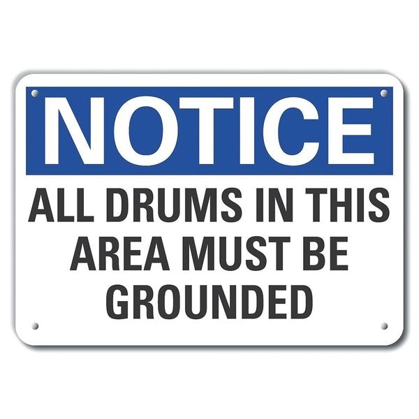 Plastic Electrical Ground Notice Sign, Vertical Rectangle, Number of Printed Sides 1, English, Sign Format ANSI/OSHA Format, Sign Legend All Drums In This Area Must Be Grounded, Sign Legend Background Color White, Sign Legend Style Text