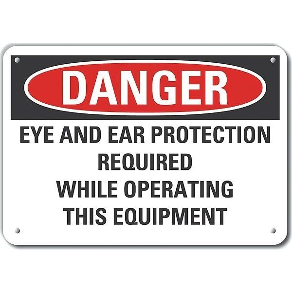 Plastic Eye & Ear Danger Sign, Horizontal Rectangle, Number of Printed Sides 1, English, Sign Format Traditional OSHA, Sign Legend Eye And Ear Protection Required While Operating This Equipment, Sign Legend Background Color White, Sign Legend Style Text