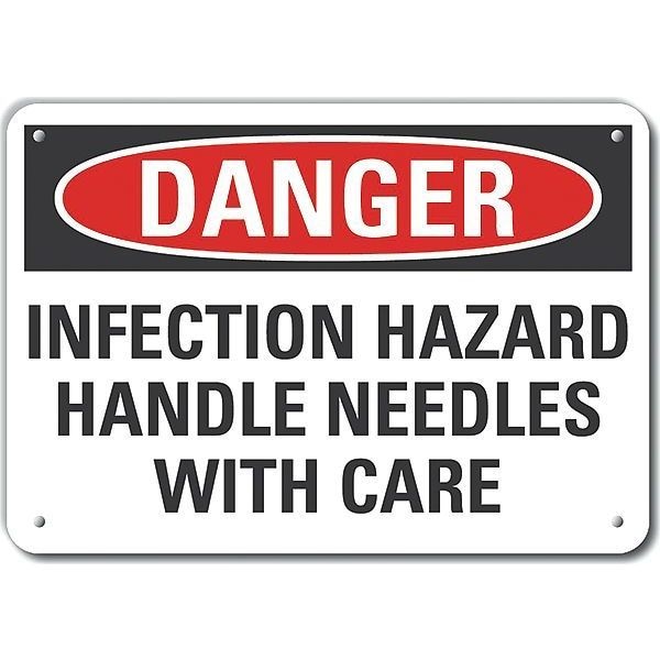 Plastic Infection Hazard Danger Sign, Vertical Rectangle, Number of Printed Sides 1, English, Sign Format Traditional OSHA, Sign Legend Infection Hazard Handle Needles With Care, Sign Legend Background Color White, Sign Legend Style Text