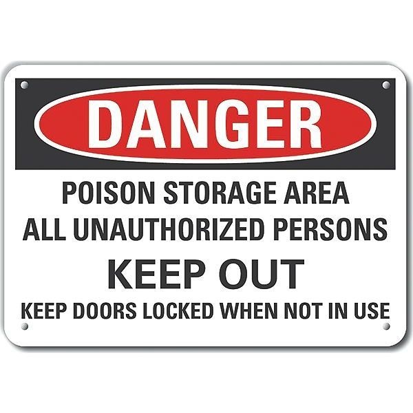 Plastic Poison Danger Sign, Vertical Rectangle, Number of Printed Sides 1, English, Sign Format Traditional OSHA, Sign Legend Poison Storage Area All Unauthorized Persons Keep Out Keep Doors Locked When Not In Use, Sign Legend Background Color White, Sign Legend Style Text