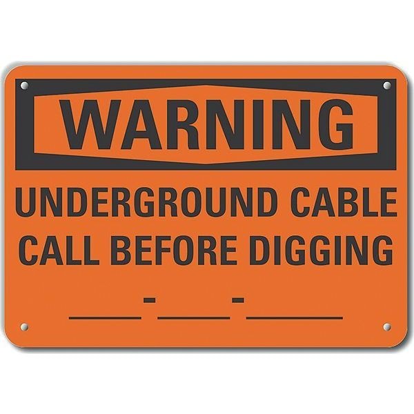 Plastic Underground Cable Warning Sign, Horizontal Rectangle, Number of Printed Sides 1, English, Sign Format Traditional OSHA, Sign Legend Underground Cable Call Before Digging ___-___-___, Sign Legend Background Color Orange, Sign Legend Style Text