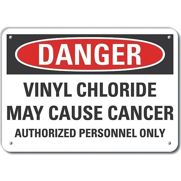 Plastic Vinyl Chloride Danger Sign, Vertical Rectangle, Number of Printed Sides 1, English, Sign Format Traditional OSHA, Sign Legend Vinyl Chloride May Cause Cancer Authorized Personnel Only, Sign Legend Background Color White, Sign Legend Style Text