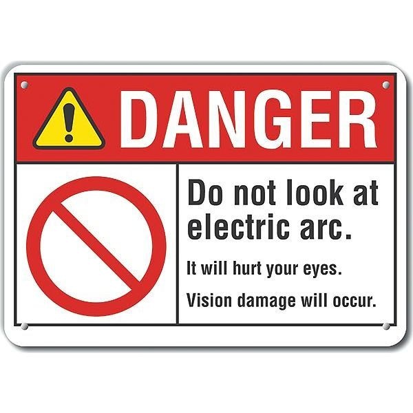 Plastic Welding Safety Danger Sign, Horizontal Rectangle, Number of Printed Sides 1, English, Sign Format ANSI/OSHA Format, Sign Legend Do Not Look At Electric Arc. It Will Hurt Your Eyes. Vision Damage Will Occur., Sign Legend Background Color White, Sign Legend Style Symbol and Text