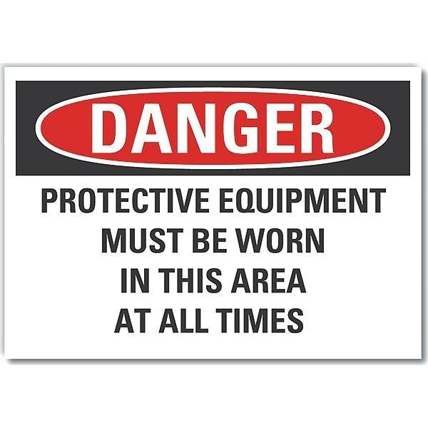 Ppe Danger Label, Horizontal Rectangle, Number of Printed Sides 1, English, Sign Format Traditional OSHA, Sign Legend Protective Equipment Must Be Worn In This Area At All Times, Sign Legend Background Color White, Sign Legend Style Text