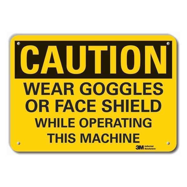 Reflective Eye & Face Caution Sign, Vertical Rectangle, Number of Printed Sides 1, English, Sign Format Traditional OSHA, Sign Legend Wear Goggles Or Face Shield While Operating This Machine, Sign Legend Background Color Yellow, Sign Legend Style Text