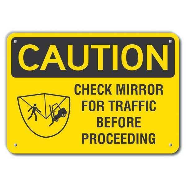 Reflective Lift Truck Caution Sign, Vertical Rectangle, Number of Printed Sides 1, English, Sign Format ANSI/OSHA Format, Sign Legend Check Mirror For Traffic Before Proceeding, Sign Legend Background Color Yellow, Sign Legend Style Symbol and Text