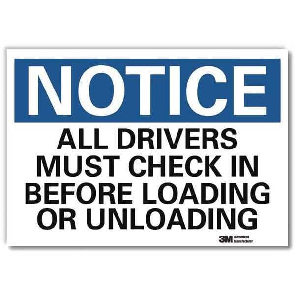 Reflective Loadiing & Unloading Label, Vertical Rectangle, Number of Printed Sides 1, English, Sign Format Traditional OSHA, Sign Legend All Drivers Must Check In Before Loading or Unloading, Sign Legend Background Color White, Sign Legend Style Text