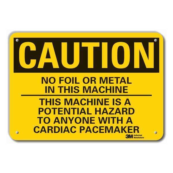Reflective Microwave Caution Sign, Horizontal Rectangle, Number of Printed Sides 1, English, Sign Format Traditional OSHA, Sign Legend No Foil Or Metal In This Machine This Machine Is A Potential Hazard To Anyone With A Cardiac Pacemaker, Sign Legend Background Color Yellow, Sign Legend Style Text