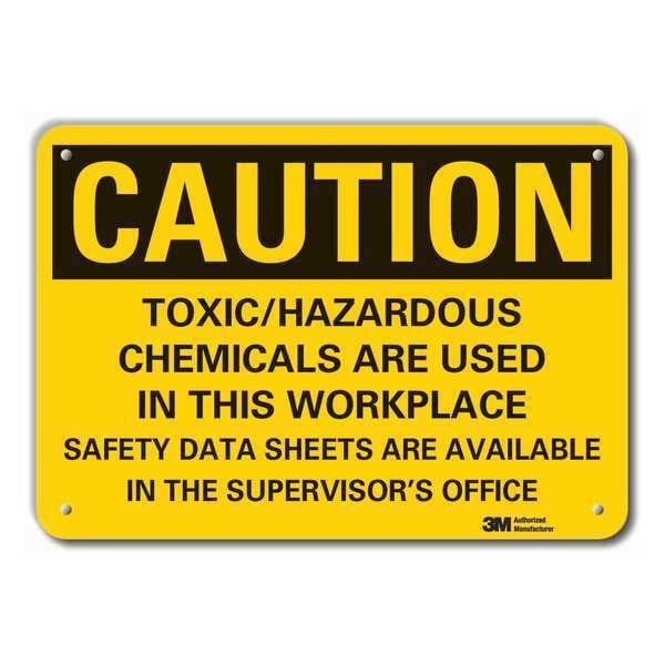 Reflective Toxic Materials Caution Sign, Horizontal Rectangle, Number of Printed Sides 1, English, Sign Format Traditional OSHA, Sign Legend Toxic/Hazardous Chemicals Are Used In This Workplace Safety Data Sheets Are Available In The Supervisors Office, Sign Legend Background Color Yellow, Sign Legend Style Text