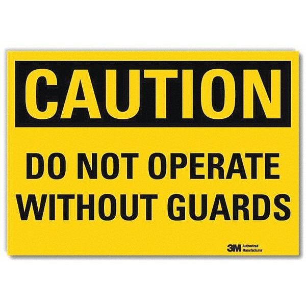 Safety Sign, Sign Subject Matter Machine Guarding, Height 10 In., Width 14 In., Sign Material Vinyl, Sign Mounting Style Adhesive Surface, Header Caution, Legend Do Not Operate Without Guards, Printed Language English, Sign Shape Rectangle