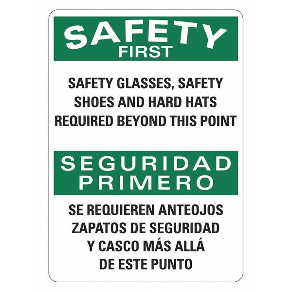 Safety Sign, Vertical Rectangle, Number of Printed Sides 1, English, Spanish, Sign Format Traditional OSHA, Sign Legend Safety Glasses, Safety Shoes And Hard Hats Required Beyond This Point/Se Requieren Anteojos, Zapatos De Seguridad Y Casco Mas Alla De Este Punto, Sign Legend Background Color White, Sign Legend Style Text