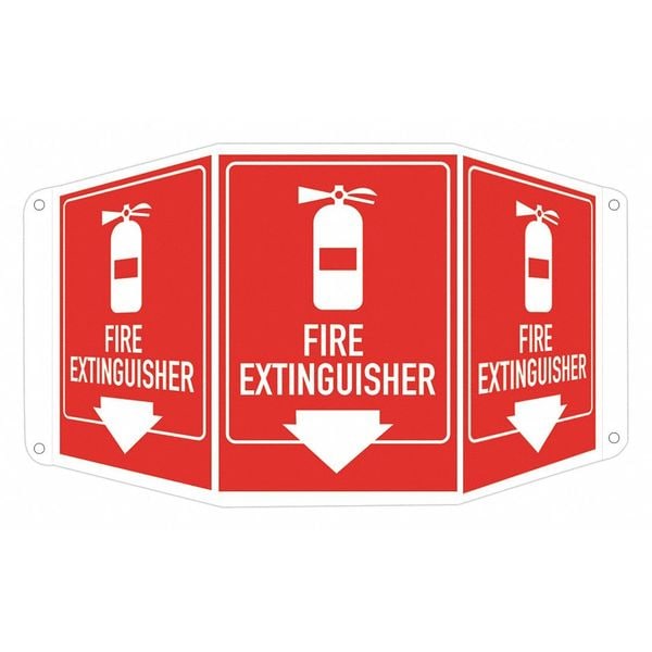 Safety Sign, Tri-Bend, Number of Printed Sides 1, English, Sign Legend Fire Extinguisher, Sign Legend Background Color Red, Sign Legend Style Symbol and Text