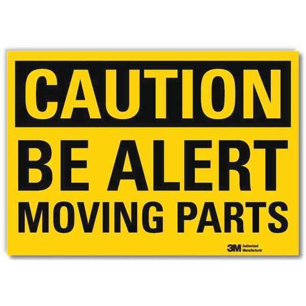 Safety Sign, Horizontal Rectangle, Number of Printed Sides 1, English, Sign Format Traditional OSHA, Sign Legend Be Alert Moving Parts, Sign Legend Background Color Yellow, Sign Legend Style Text