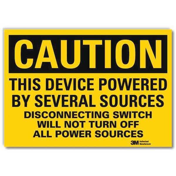 Safety Sign, Horizontal Rectangle, Number of Printed Sides 1, English, Sign Format Traditional OSHA, Sign Legend This Device Powered By Several Sources Disconnecting Switch Will Not Turn Off All Power Sources, Sign Legend Background Color Yellow, Sign Legend Style Text