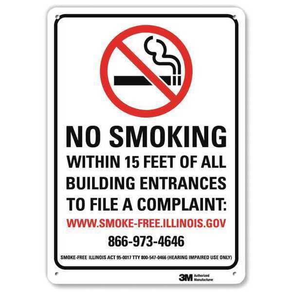 Safety Sign, Horizontal Rectangle, Number of Printed Sides 1, English, Sign Format Other Format, Sign Legend No Smoking Within 15 Feet Of All Building Entrances To File A Complaint: Www.Smoke-Free.Illinois.Gov 866-973-4646 Smoke-Free Illinois Act 95-0017 Tty 800-547-0466 (Hearing Impaired Use Only), Sign Legend Background Color White, Sign Legend Style Symbol and Text